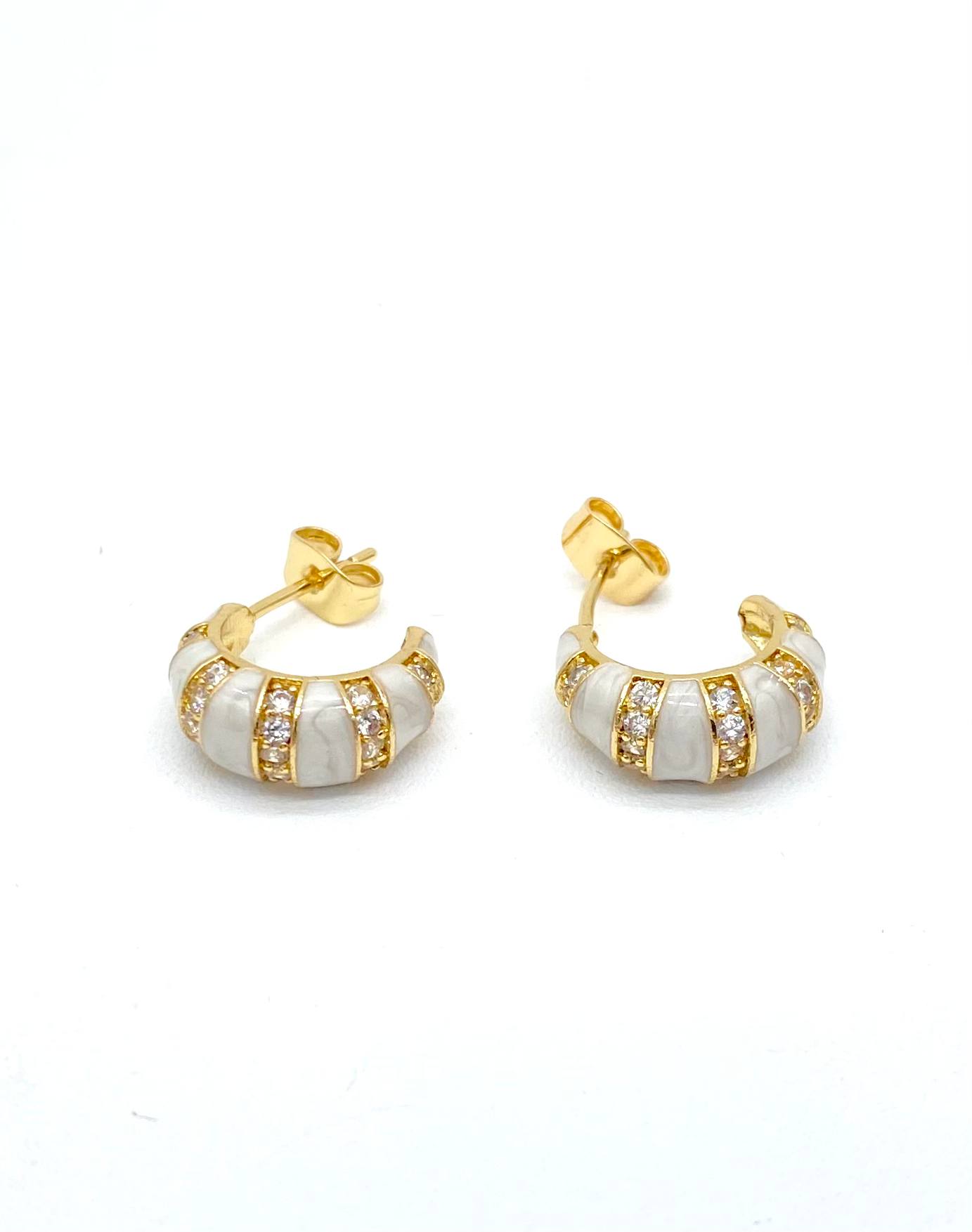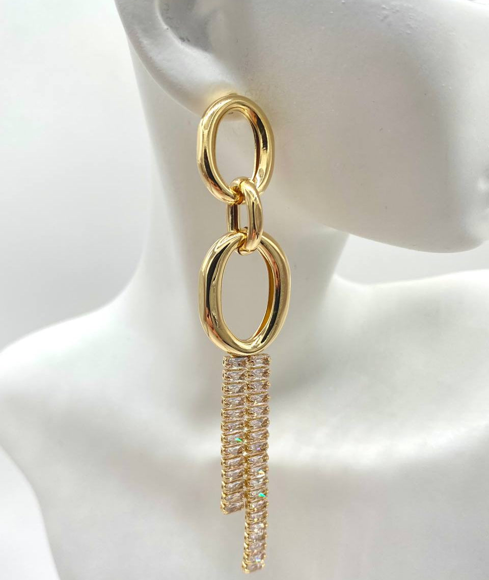 Arete largo estilo fiesta en chapa de oro 18k, color dorado. En forma de cadena con líneas colgantes de circonias.