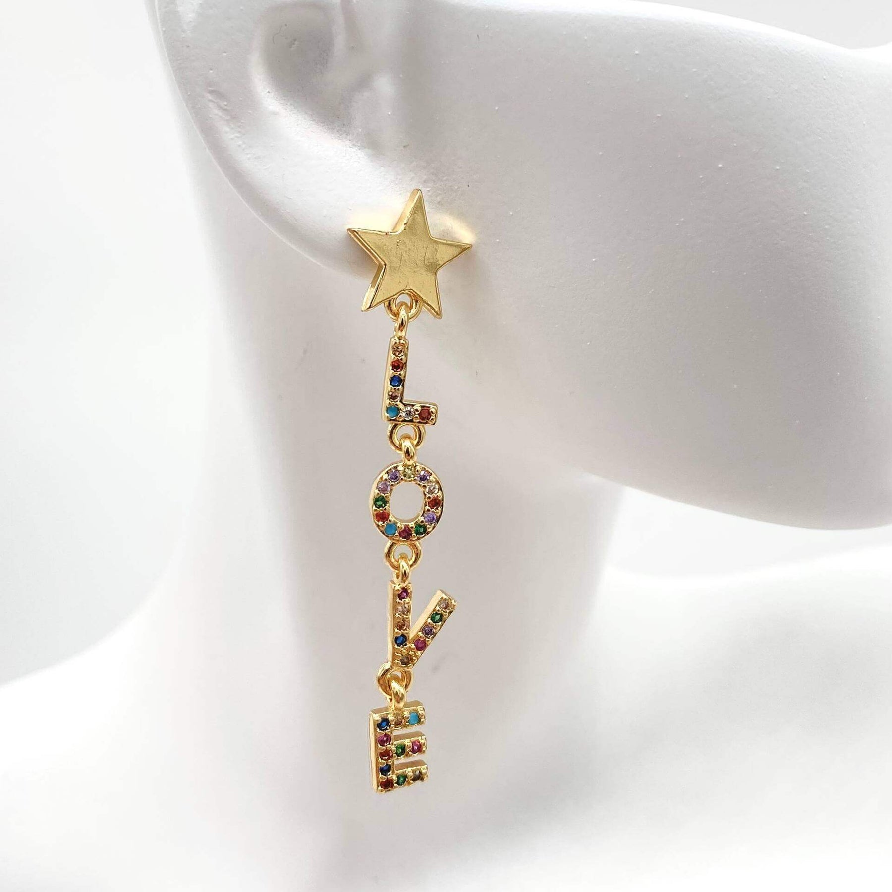 Aretes colgantes con la palabra love, elaborados en chapa de oro 18K y cubiertos de zirconias de colores. Diseño elegante y perfecto para cualquier ocasión.