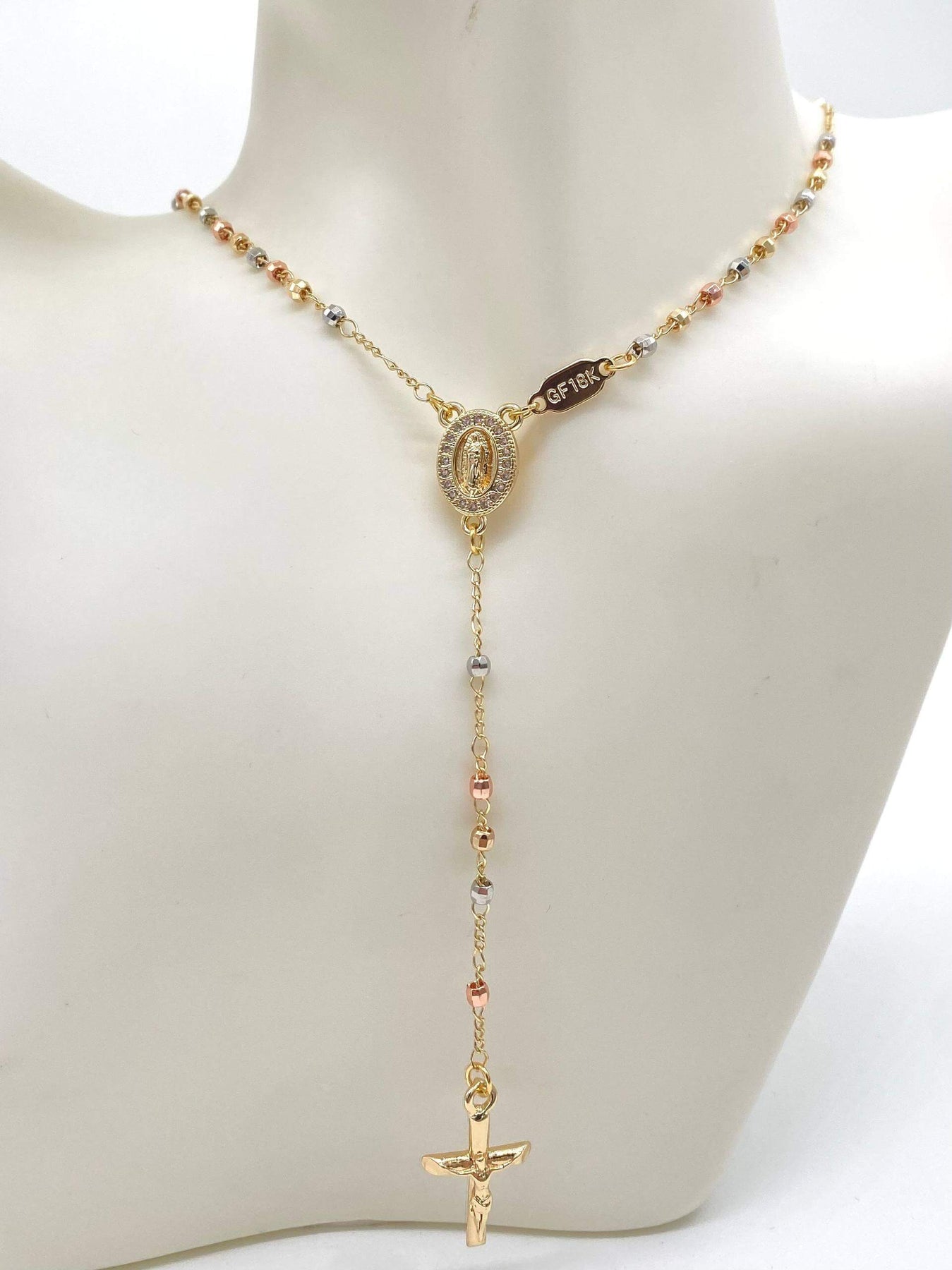 Rosario florentino con virgen guadalupe, elaborado en chapa de oro 18K y adornado con zirconias .