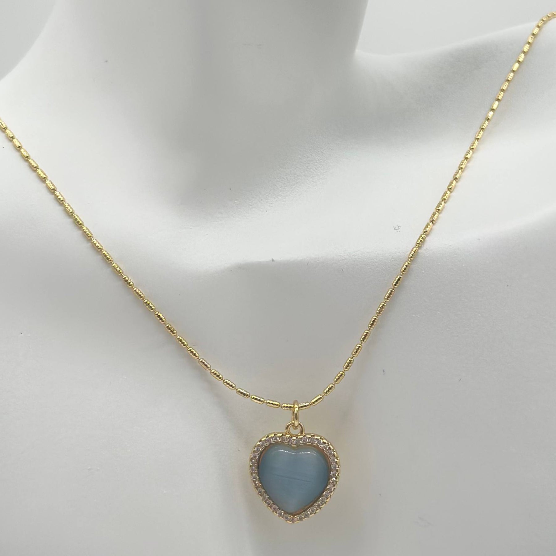 Cadena con dije en forma de corazon azul con zirconia, elaborados en chapa de oro 18K. Diseño elegante y perfecto para cualquier ocasión.
