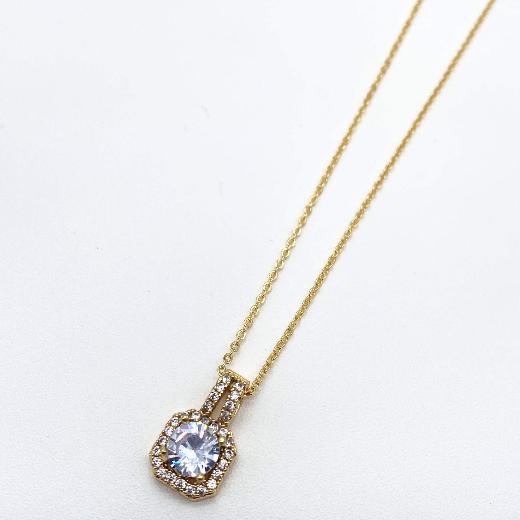 Collar con dije cuadro zirconia, elaborado en chapa de oro 18K y adornado con zirconias. Elegante, único y perfecto para destacar cualquier look.