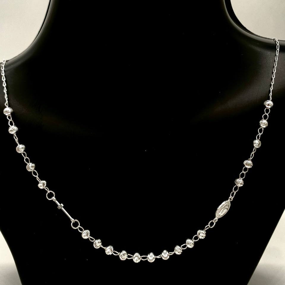 Cadena estilo rosario con bolitas facetadas e imagen de San Benito y dije de cruz, con broche de argolla en plata 925 mexicana.
