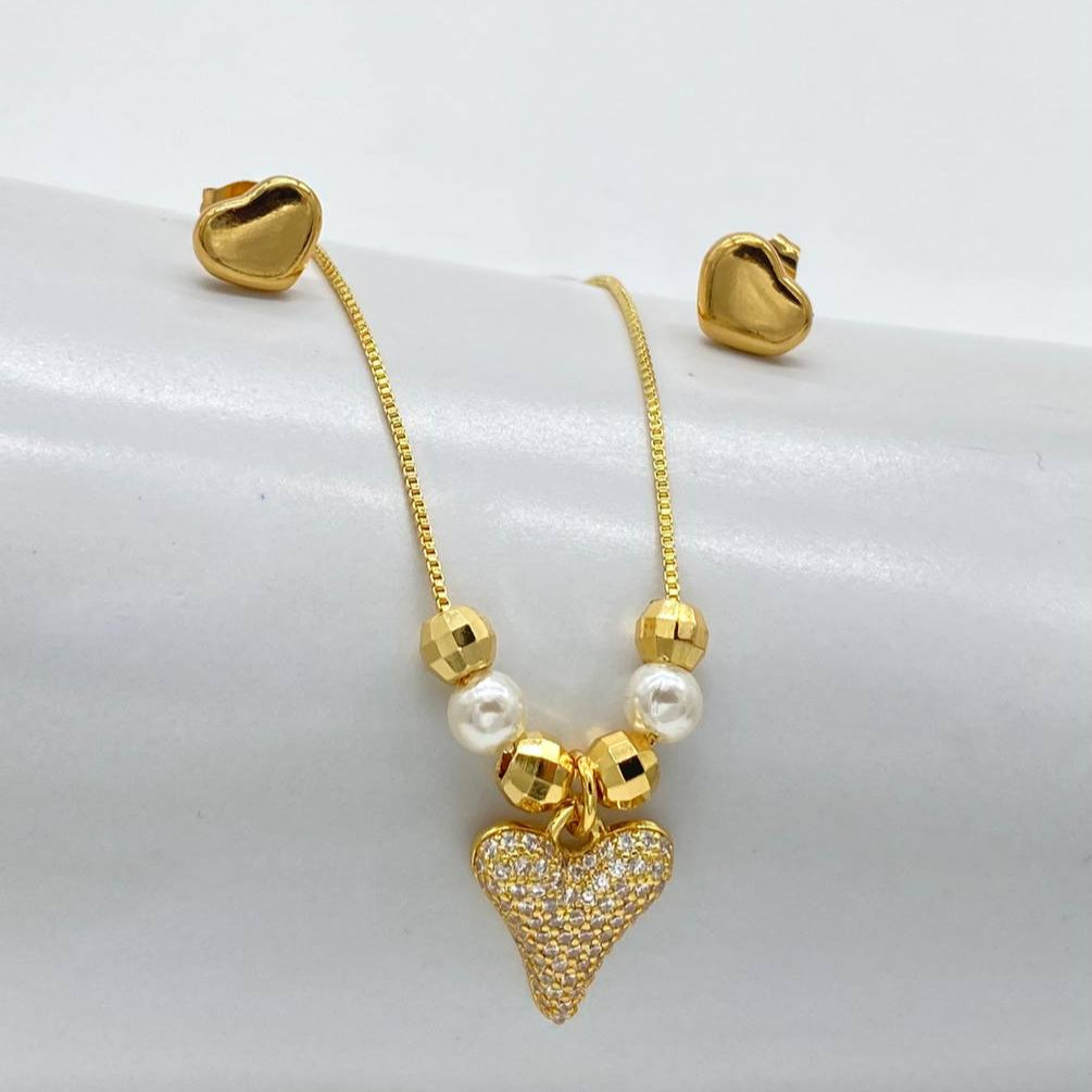 Juego en forma de cerezas con zirconias en chapa de oro 18k, incluye cadena, dije y aretes.