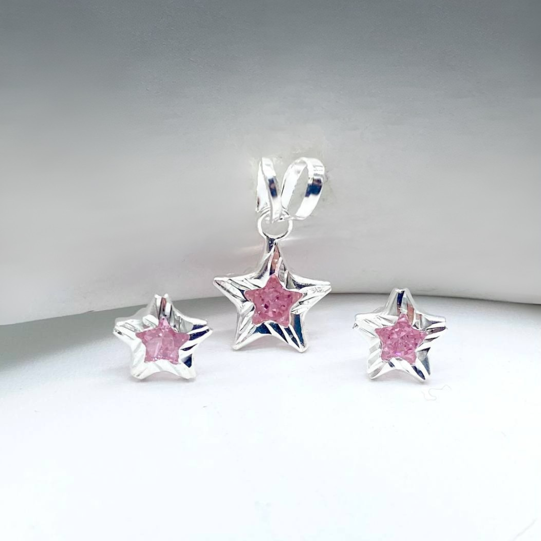 Juego de arete y dije en forma de estrella en color negro con bordes texturizados, cierre de mariposa en la parte de atrás en plata 925 mexicana.