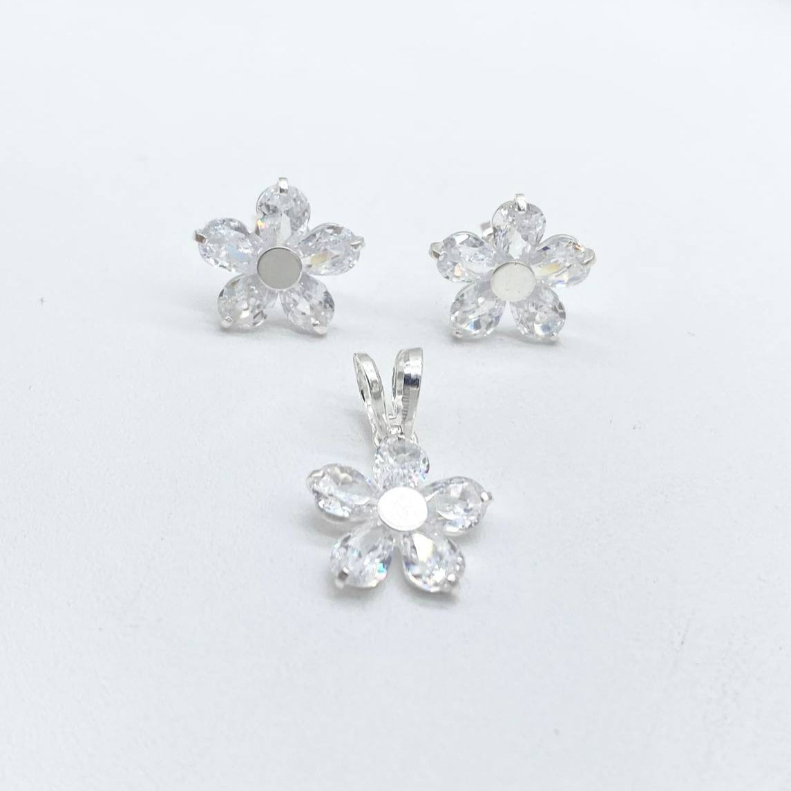 Juego de arete y dije en forma de estrella en color rosa con bordes texturizados, cierre de mariposa en la parte de atrás en plata 925 mexicana.
