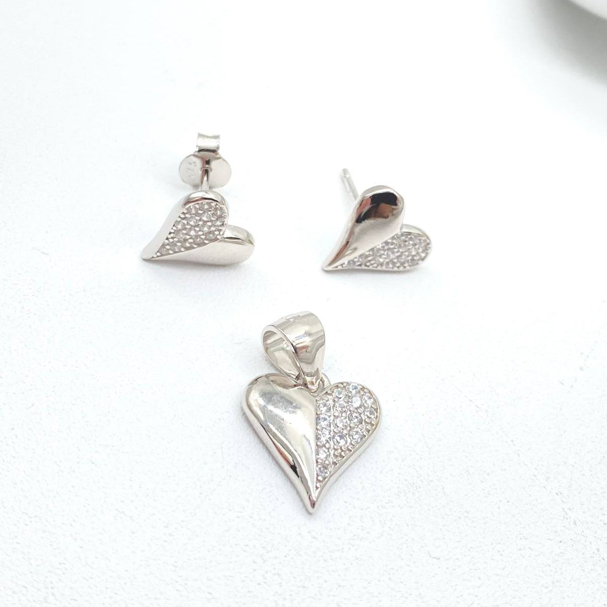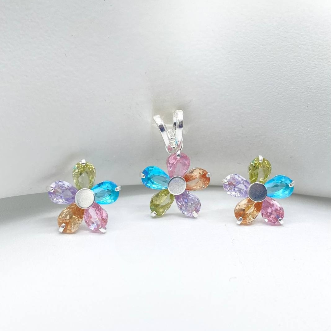 Juego de aretes y dije en forma de flor con zirconia, con cierre de mariposa en la parte de atrás en plata 925 mexicana.