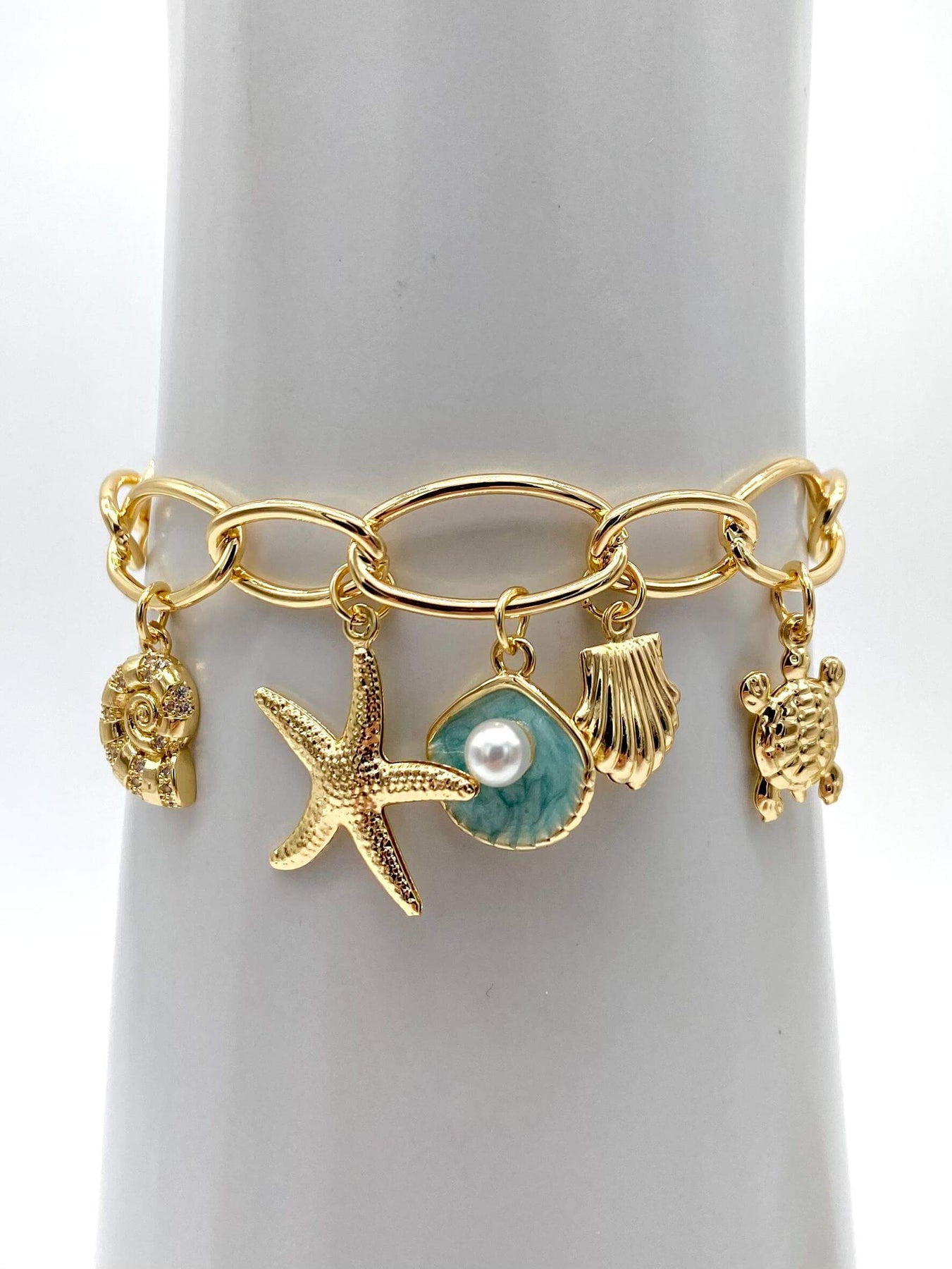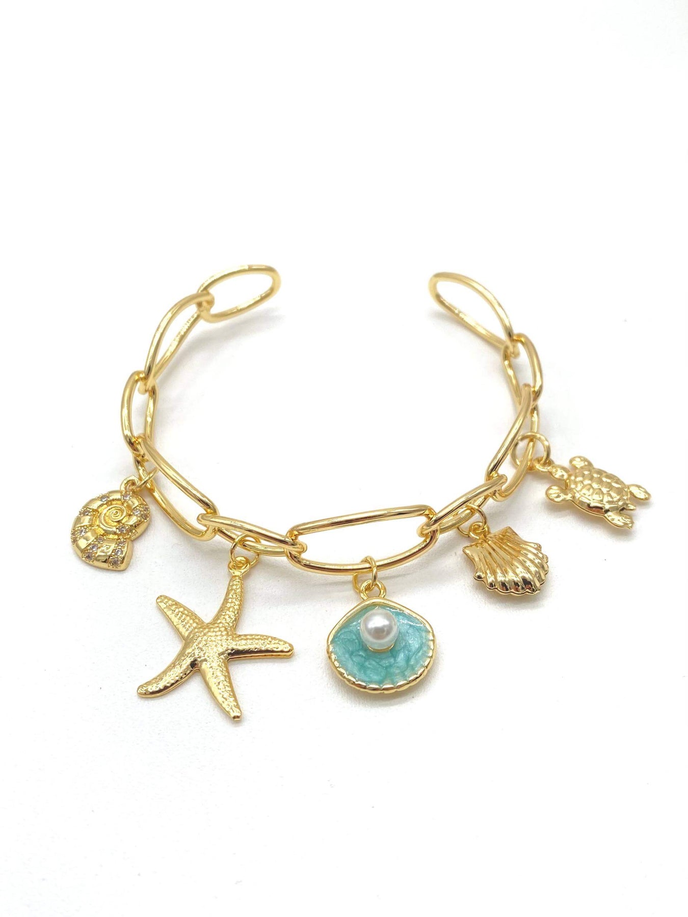Brazalete con figuras de mar colgantes, elaborados en chapa de oro 18K. Diseño elegante y perfecto para cualquier ocasión.