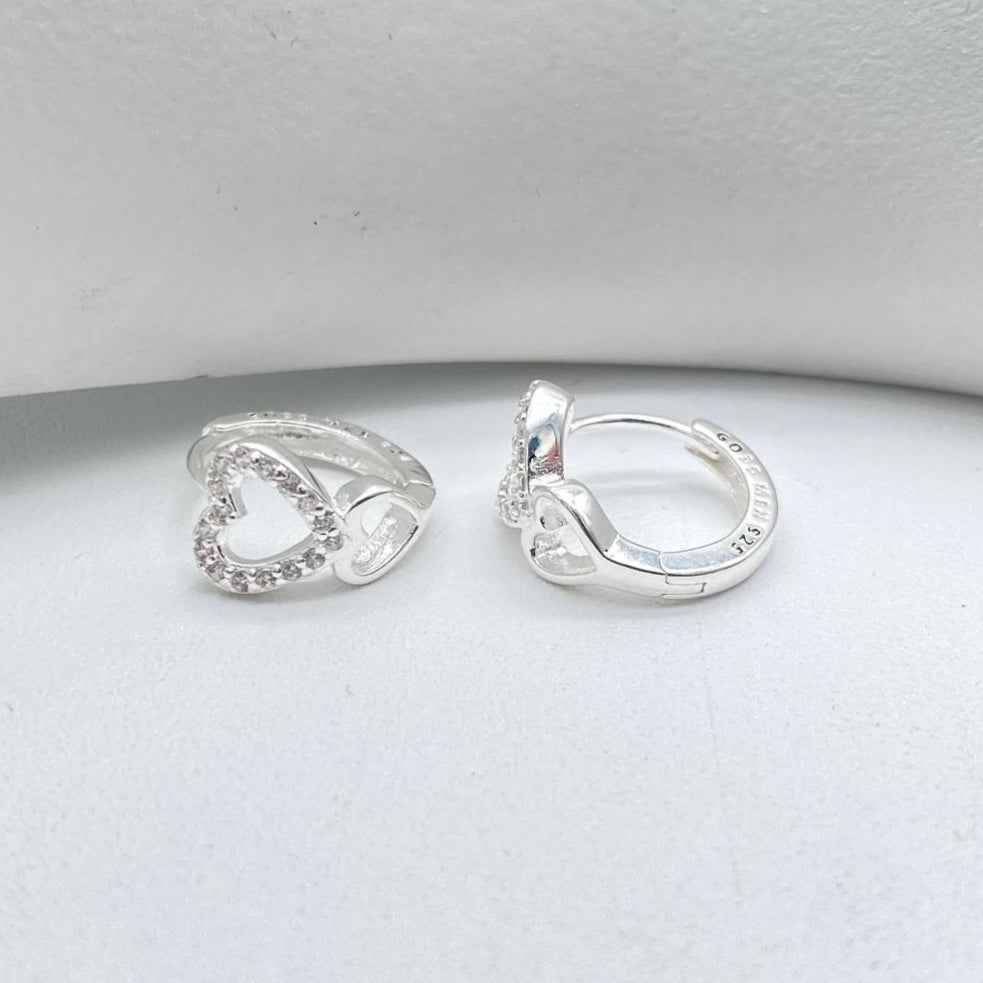 Huggie con diseño de corazón con zirconias en plata 925 mexicana.
