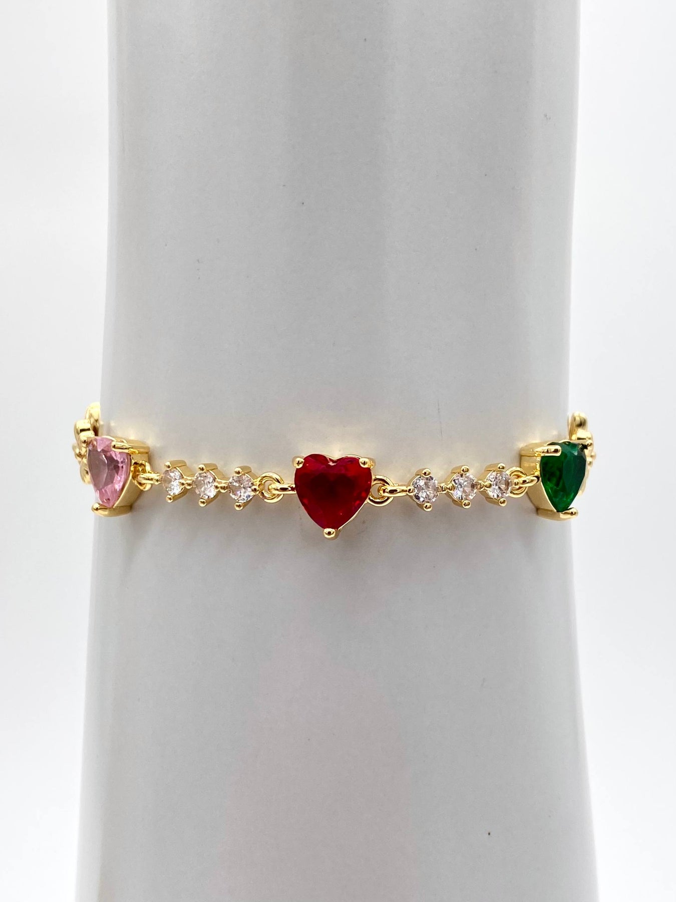 Pulso chapa de oro 18k, color dorado con tres corazones con zirconias.
