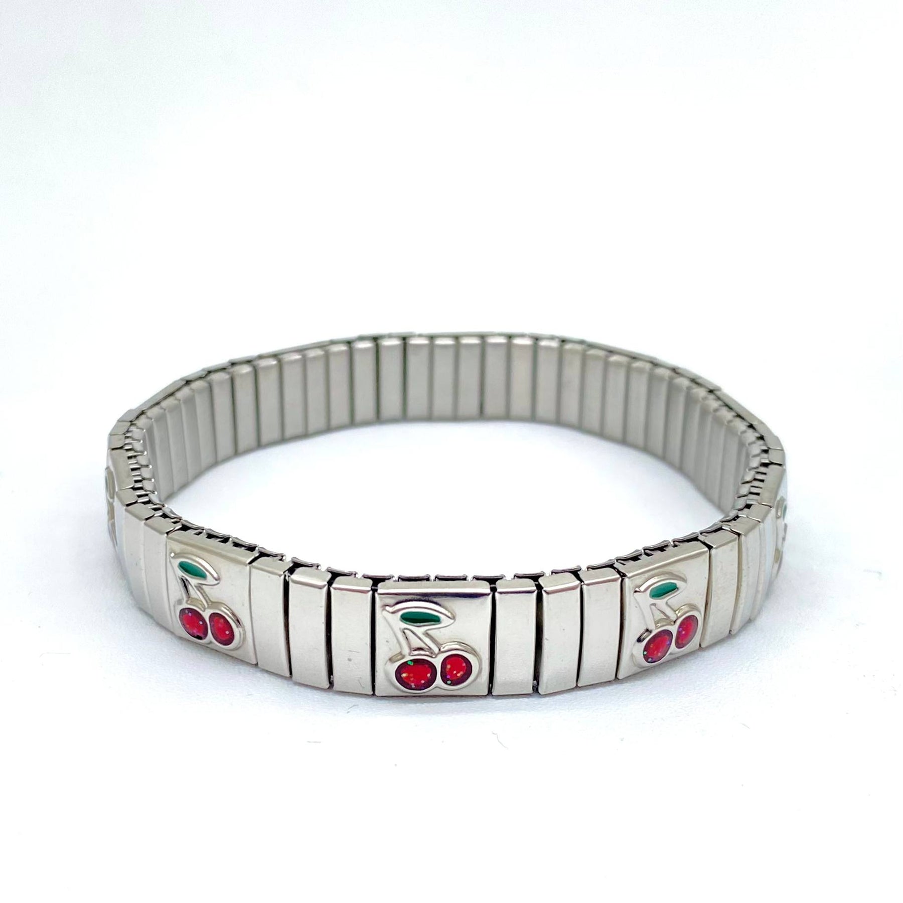 Brazalete en acero inoxidable con cerezas, ajustable.