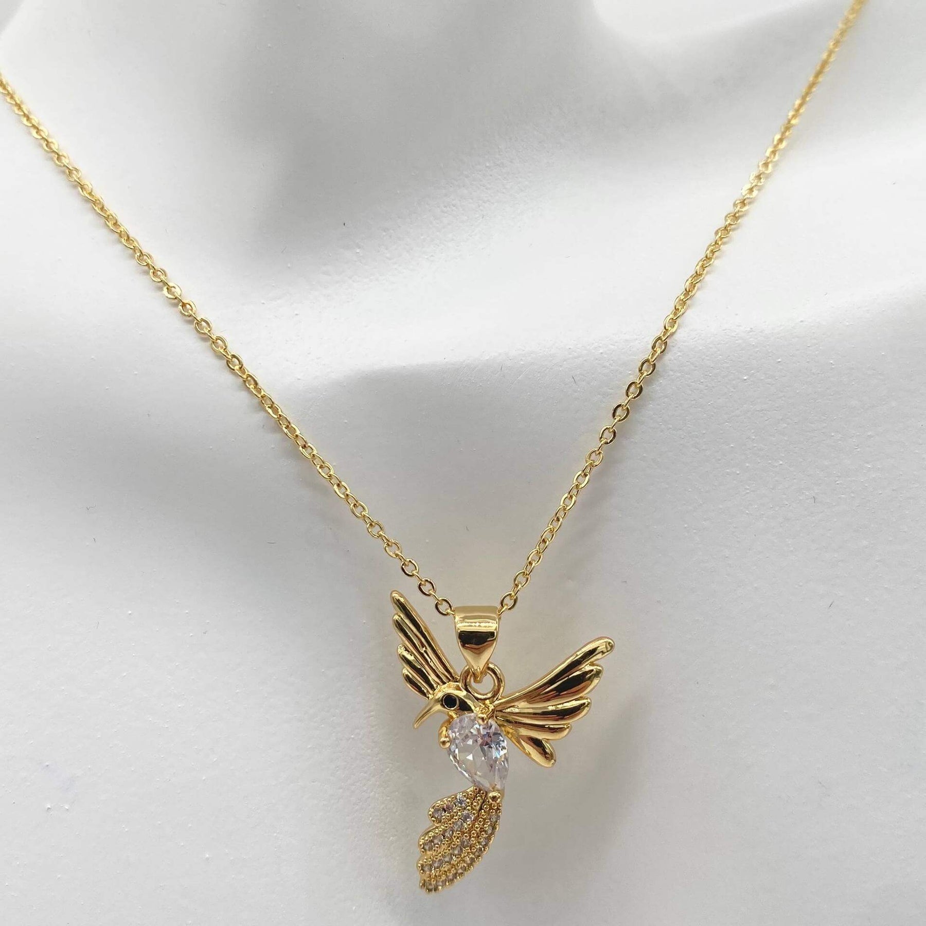 Collar con dije colibri elaborado en chapa de oro 18K y adornado con zirconias. Elegante, único y perfecto para destacar cualquier look.