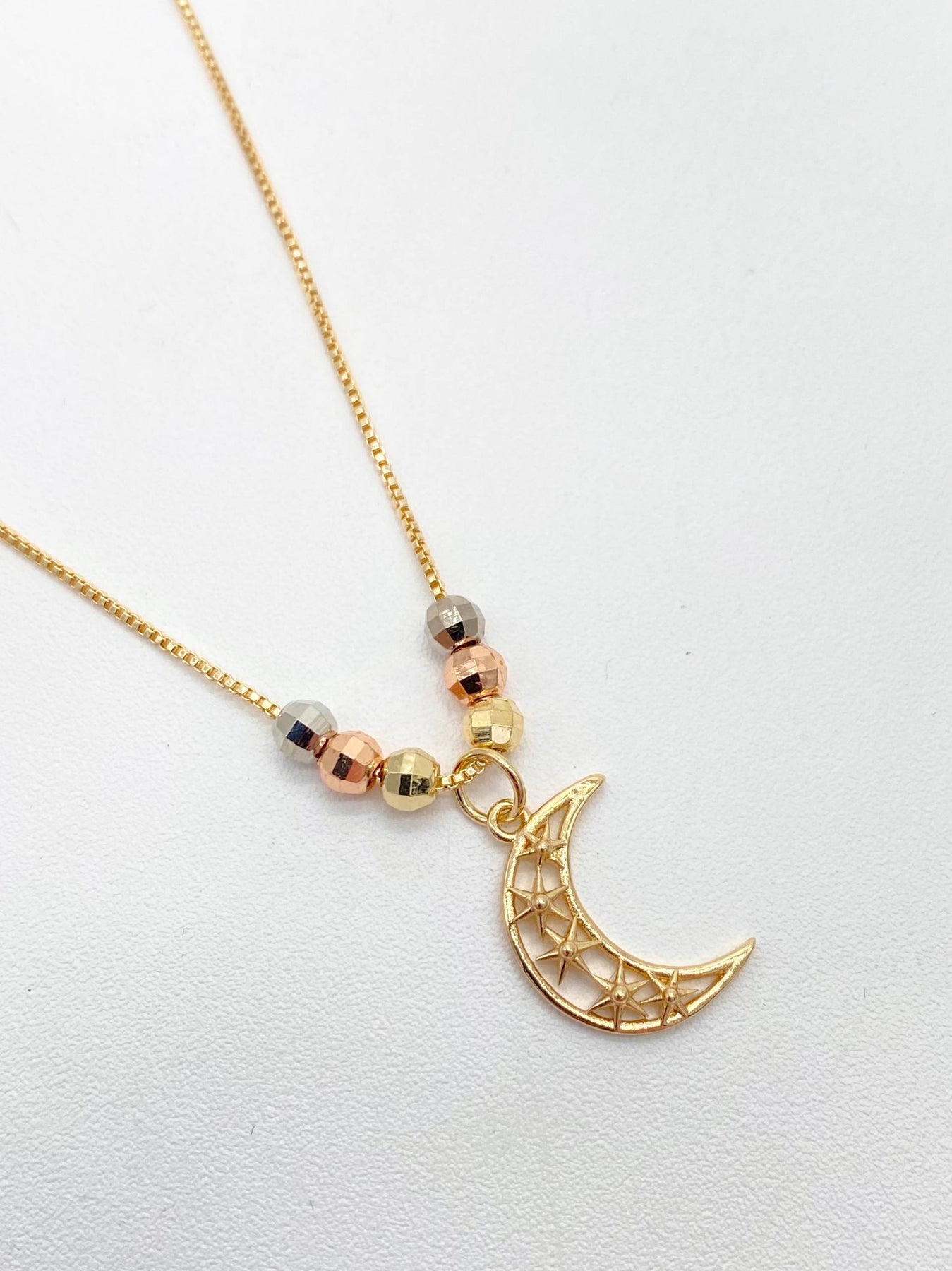 Cadena en chapa de oro 18k, con dije de luna con estrellas y bolas texturizadas florentino.