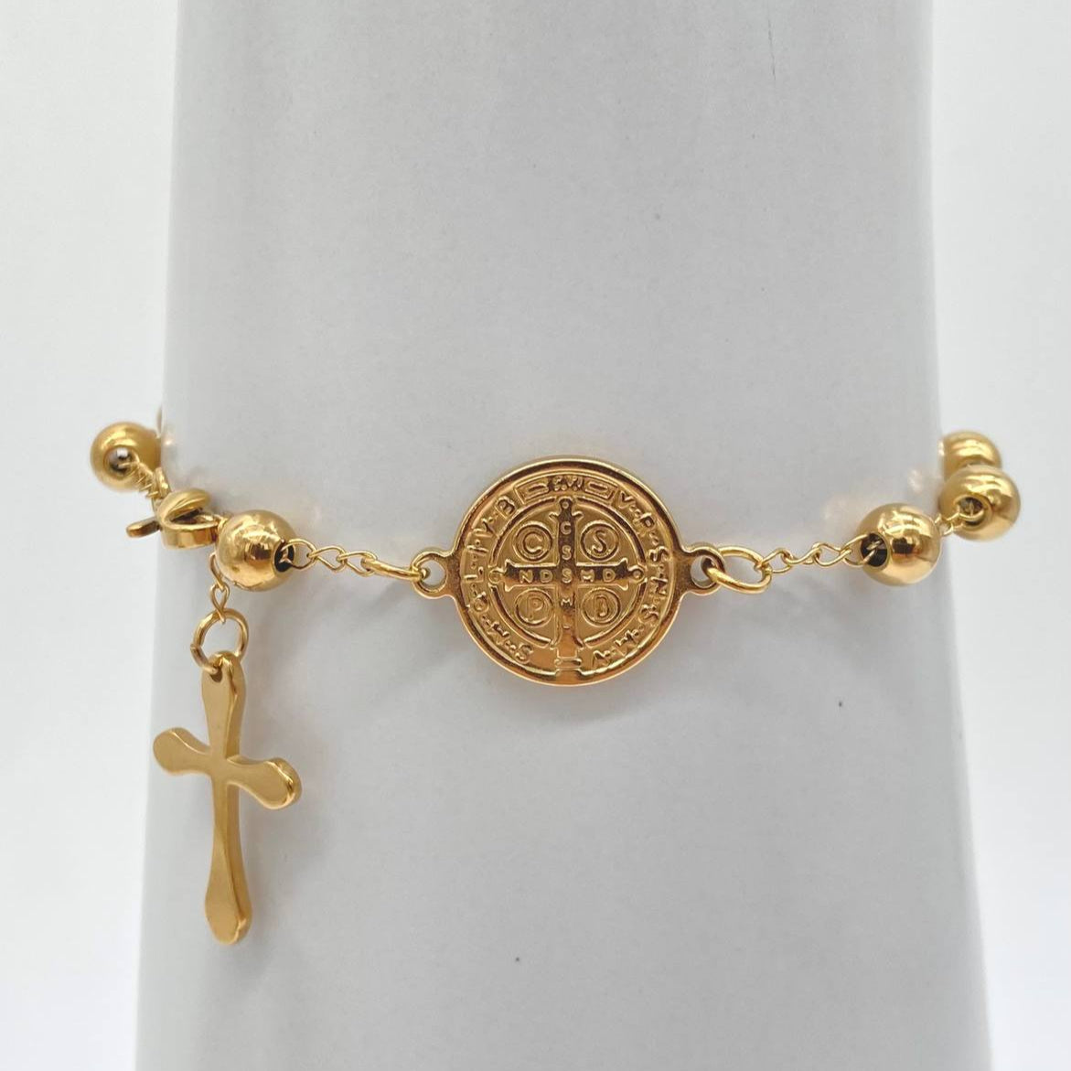 Semanario en acero inoxidable, color dorado, con medalla de San Benito y cruz.
