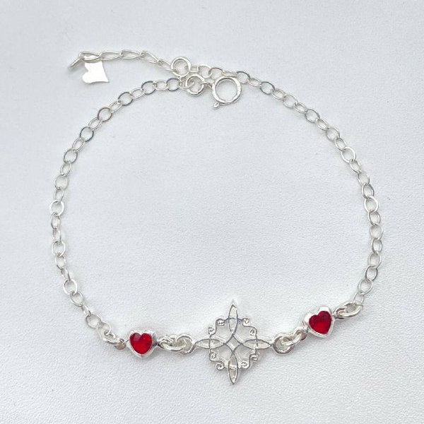 Pulsera con figura de nudo de bruja con dos corazones en color rojo, broche de argolla en plata 925 mexicana.