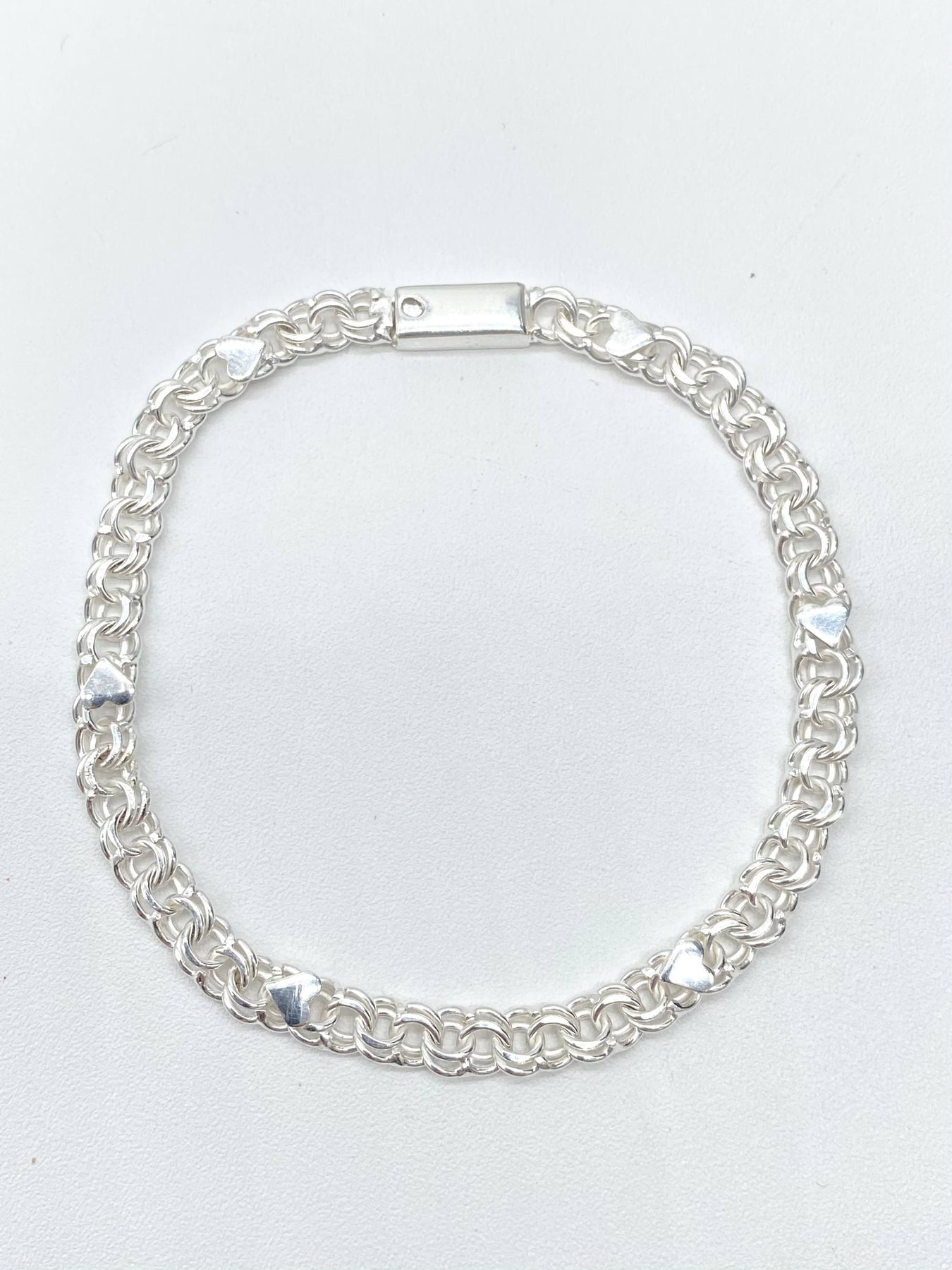 Pulso de tejido chino con corazones, broche de perico en plata 925 mexicana.