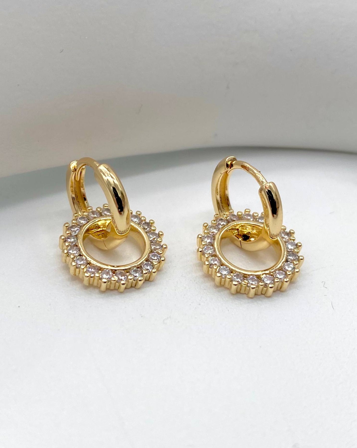 Huggie en chapa de oro 18k, Circulo colgante con zirconia