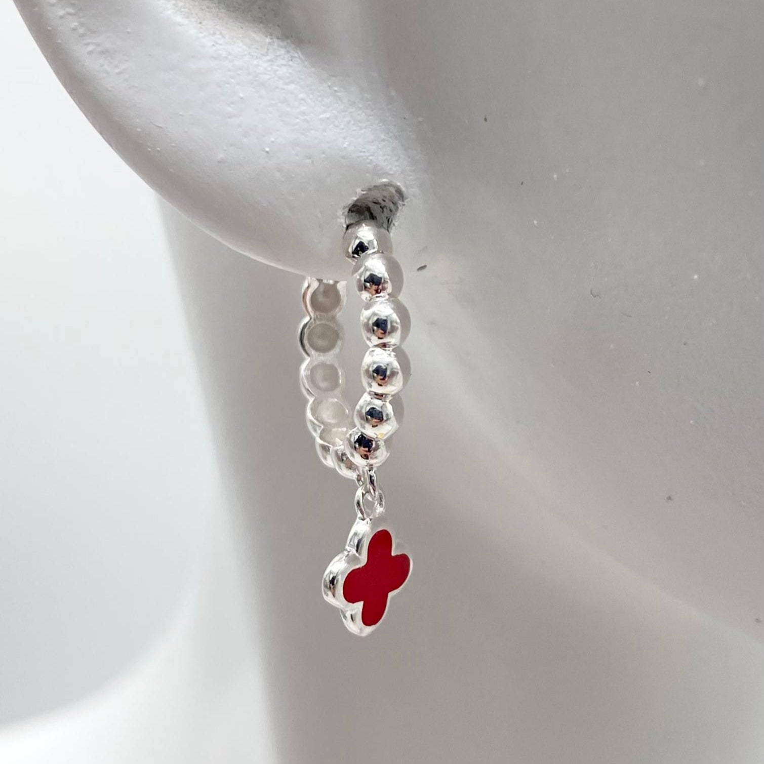 Huggie con dije colgante tipo trebol esmaltado rojo, en plata 925 italiana.