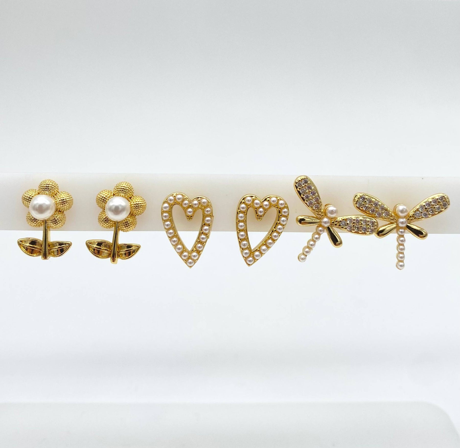 Figuras: Flor con perla, Corazón con perla y libélula con zirconias y perla