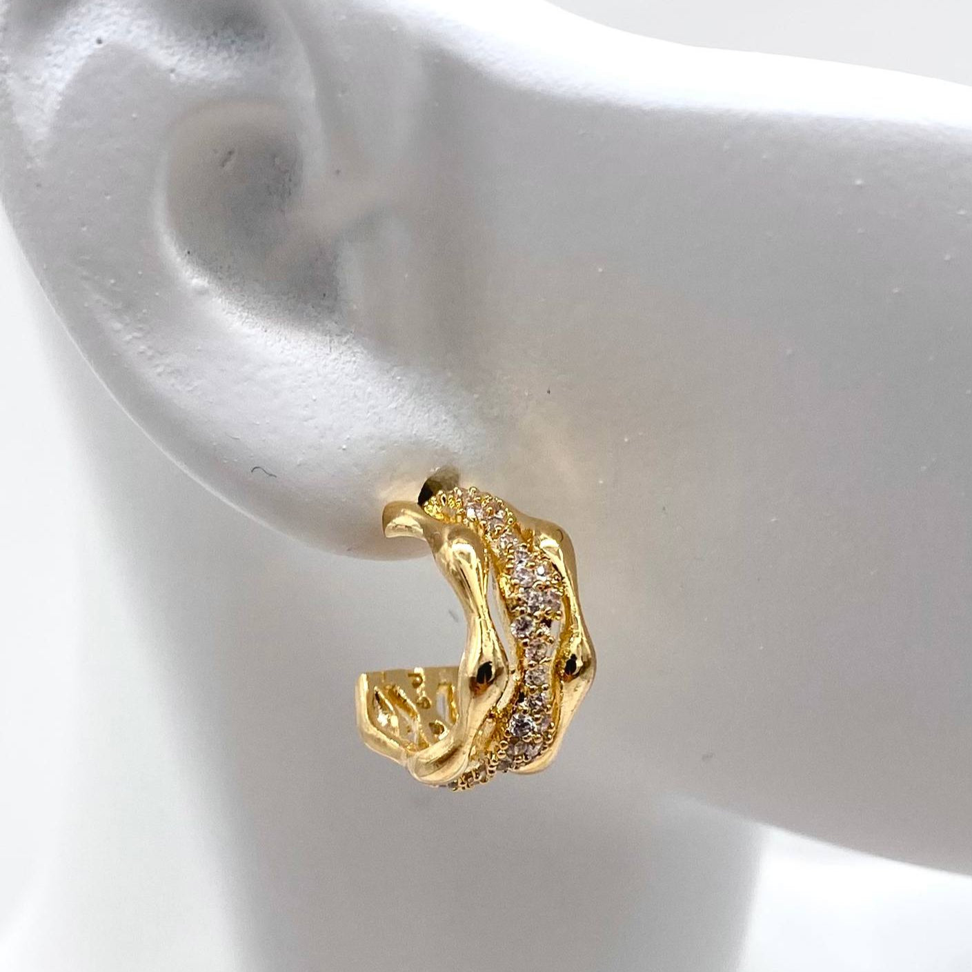 Arracada media mini con zirconias, en chapa de oro 18k
