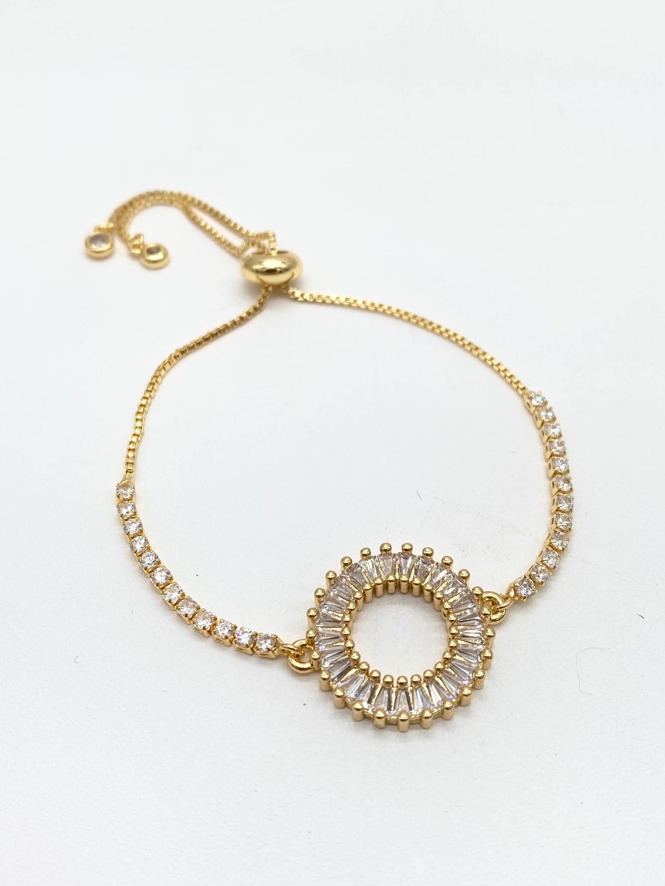 Pulsera en chapa de oro 18k, color dorado con circulo con zirconias ajustable.